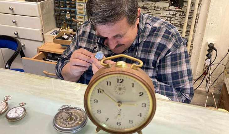 Konya'da çırak olarak 10 yaşında saat tamirciliği mesleğine başlayan Abdullah Özpınar, 10 metrekare dükkanda 41 yıldır saat tamir ediyor.